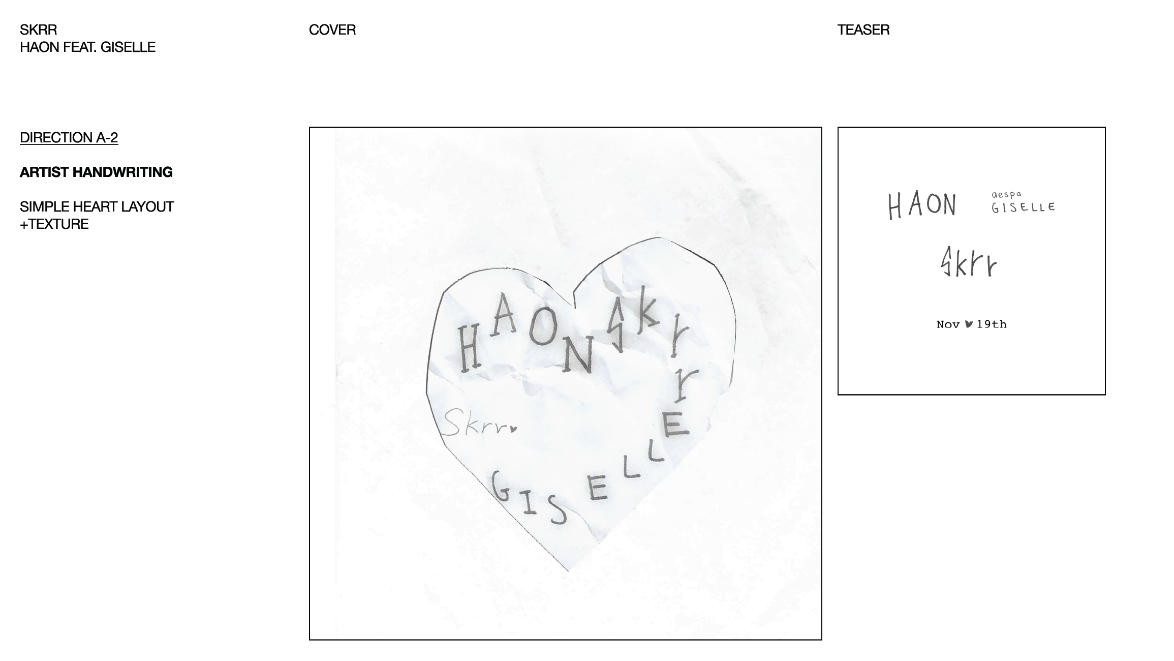 Designed cover artworks for musician HAON’s single album ‘Skrr (feat. GISELLE of aespa).’ Directions were created using artists’ handwritting and doodles.
